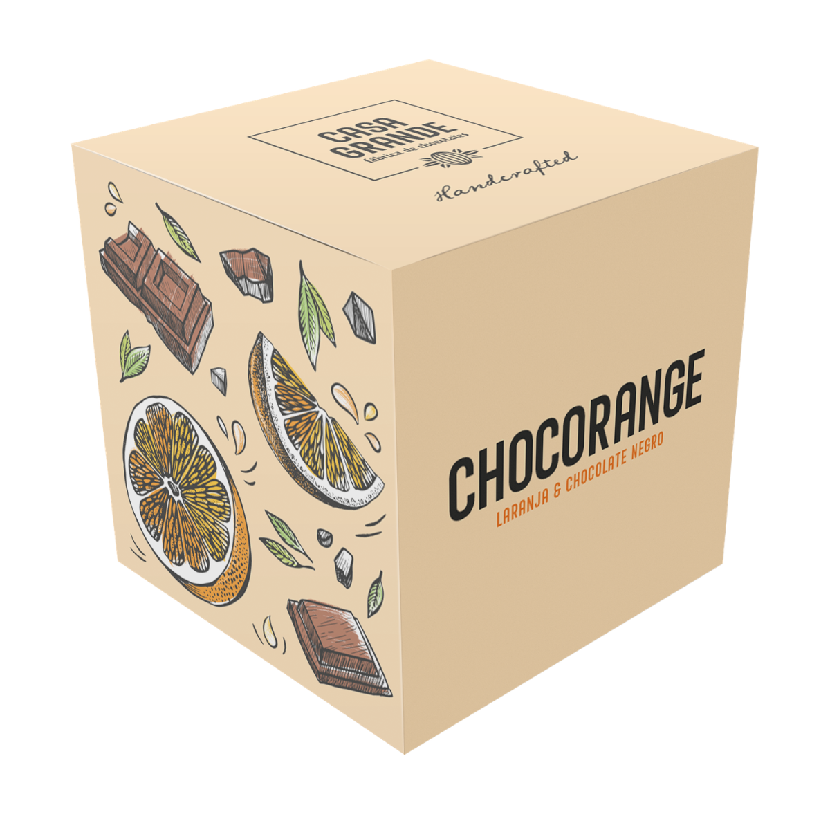 Casca de laranja confitada (50,5%) (casca de laranja, xarope de glucose-frutose, açúcar), açúcar, pasta de cacau, manteiga de cacau e emulsionante (lecitina e soja). Cacau: 50% mínimo no chocolate negro