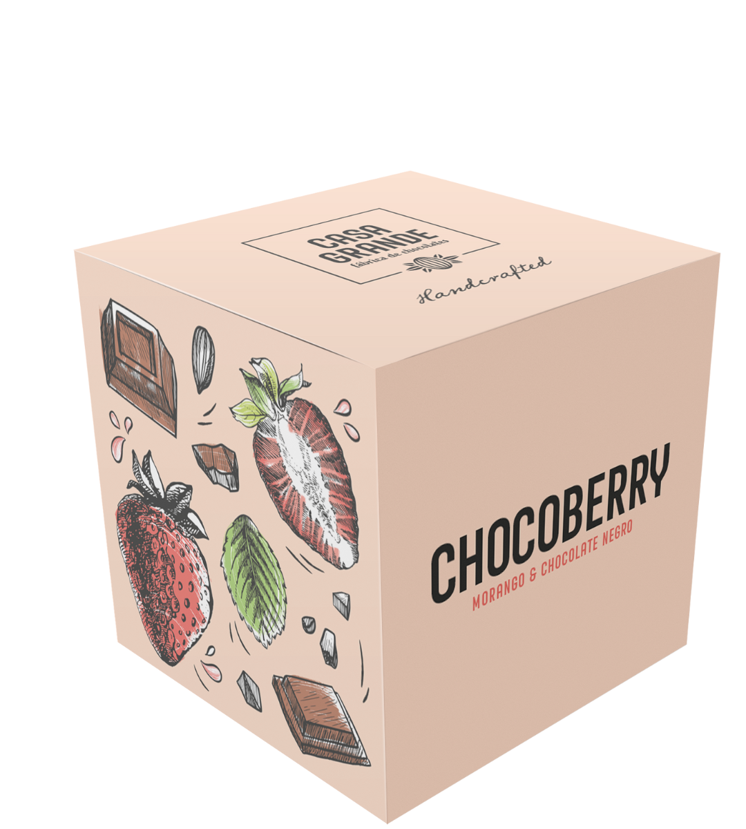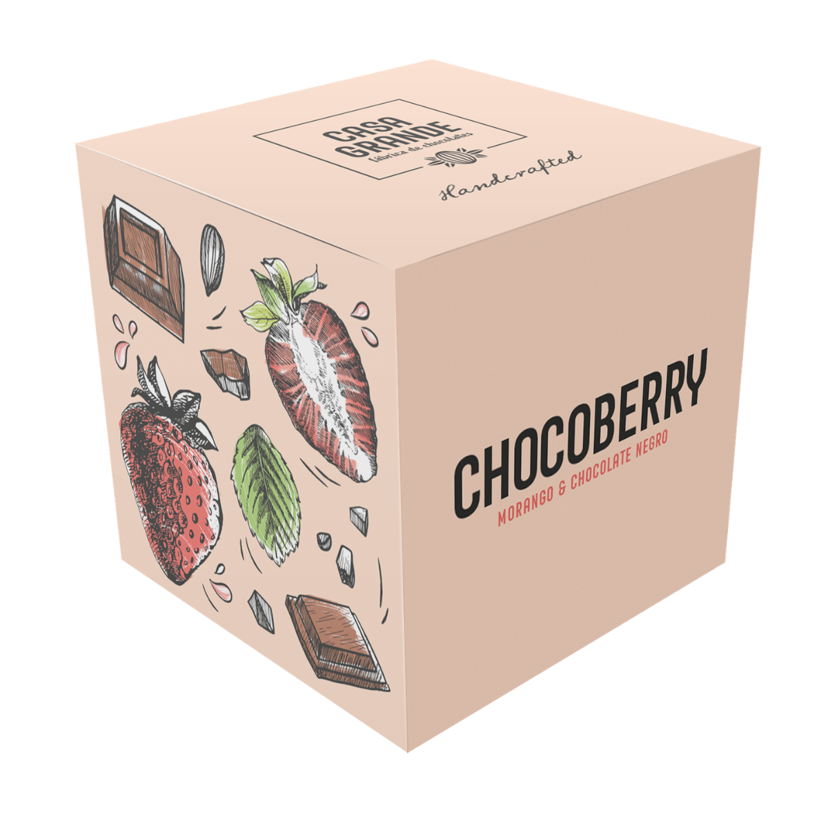 Morango (40%), açúcar, pasta de cacau, manteiga de cacau e emulsionante (lecitina de soja). Cacau: 50% mínimo no chocolate negro.